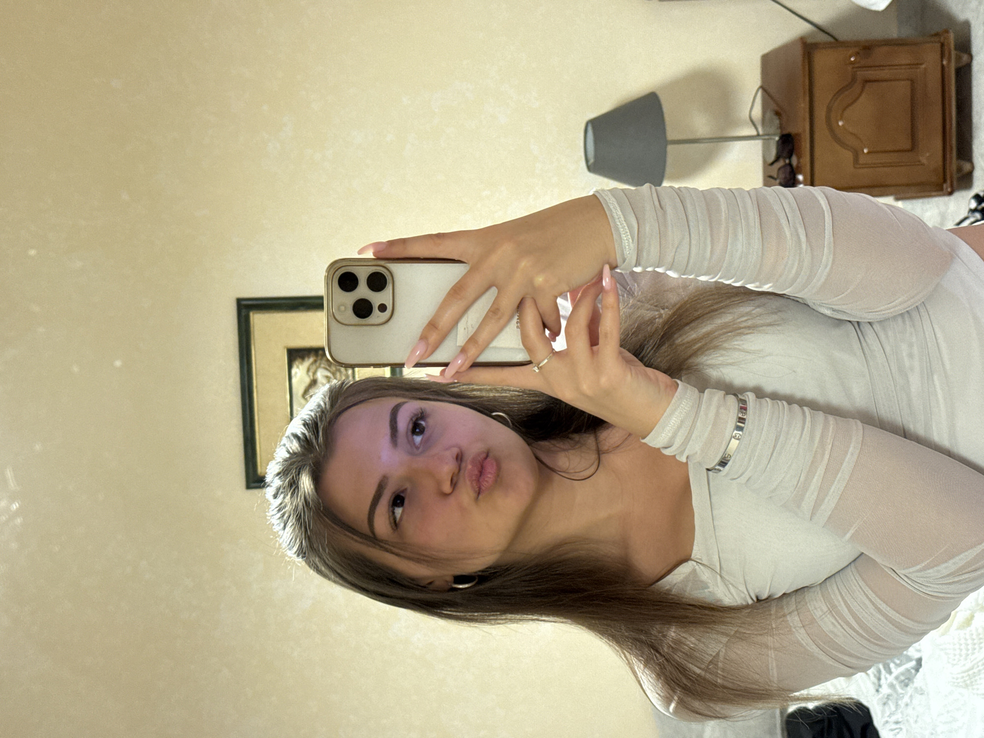A young woman is taking a selfie in a bedroom. She is wearing a white top with sheer sleeves and has light brown hair. She is holding a smartphone with a gold case. A nightstand, lamp, and framed picture are visible in the background. The location is possibly Marchevo, Bulgaria.
