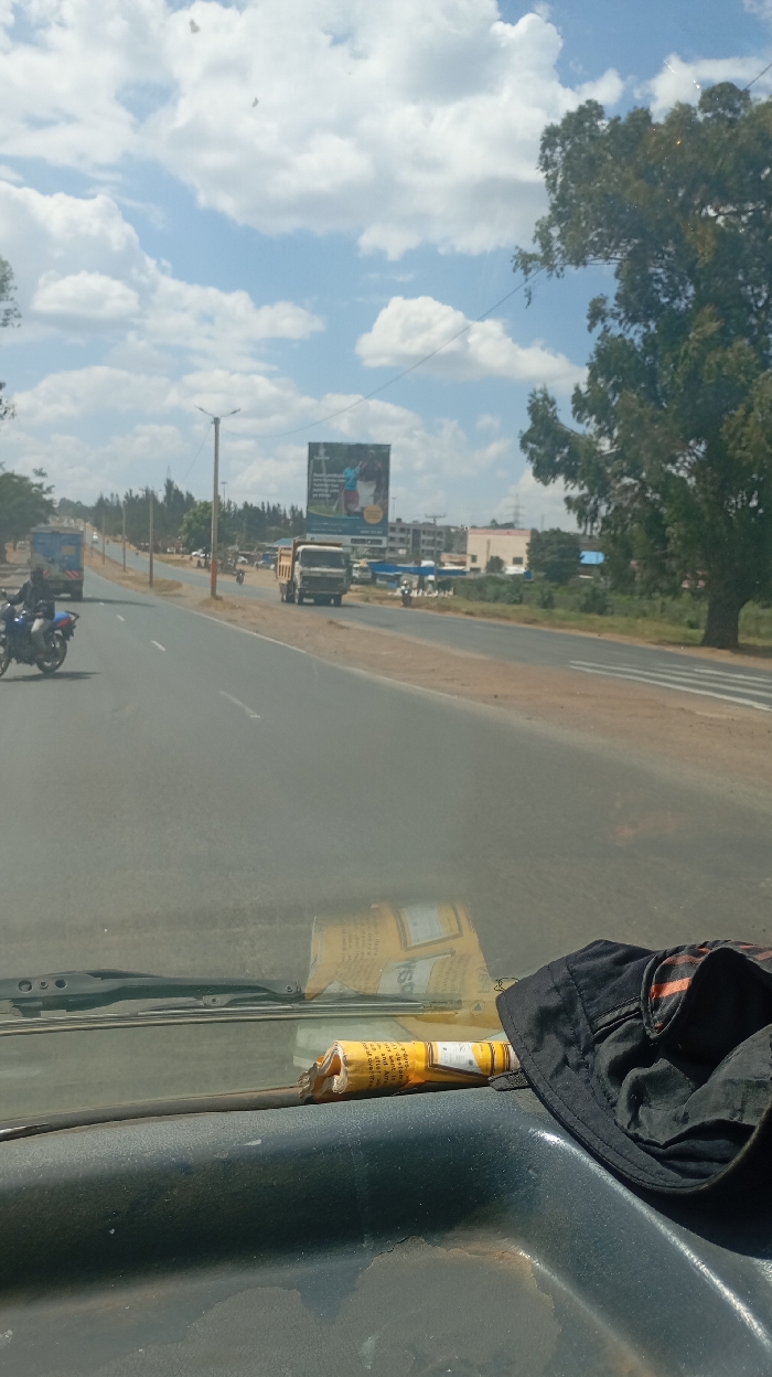 A view from inside a vehicle shows a road with several vehicles, including a motorcycle and a truck. A large billboard is visible in the distance. The sky is partly cloudy with bright sunlight. The vehicle's dashboard has a rolled-up tube and a black hat on it. The road appears to be a highway with lanes going in both directions. Some buildings are also visible along the roadside.