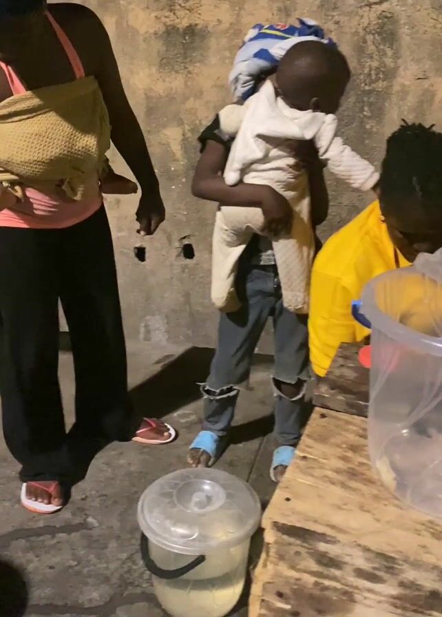 The scene captures a moment outdoors with three individuals: two adults and a child. One adult, wearing a yellow shirt, is seated at a rough wooden table, focused on something within a clear plastic tub. A second adult stands, facing forward, carrying a baby dressed in light-colored clothing. The baby appears to be positioned on the adult's back, with a patterned cloth securing the baby's head. To the left, another adult is partially visible, wearing a pink top and black pants, holding a small child wrapped in a tan cloth. A translucent bucket with liquid is on the ground near the adults. The background is a plain wall, and the ground is a simple concrete surface. The lighting suggests it may be evening or a dimly lit area.