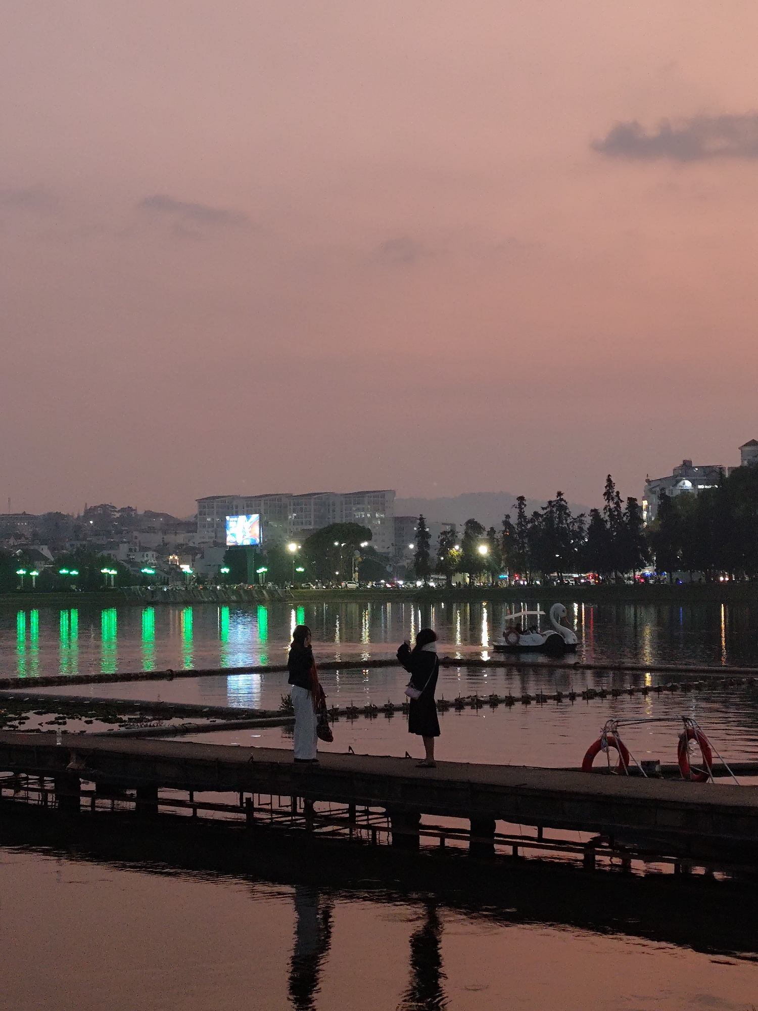 The image captures a twilight scene at Xuan Huong Lake in Da Lat, Vietnam. In the immediate foreground, a dark floating pier extends across the frame. Two individuals, appearing female, stand on this pier. The person on the left wears light trousers and a dark top, holding a dark bag, and faces towards the right. The person on the right wears a dark coat and a light scarf, facing away from the viewer towards the lake. Two red lifebuoys are affixed to the pier on the right side. The lake's surface reflects the soft pink, orange, and purple hues of the twilight sky, along with numerous artificial lights from the distant shore. Prominent green light reflections from a row of streetlights are visible on the water on the left. On the far shore, a city skyline includes several multi-story buildings and an actively illuminated, large LED screen displaying colorful content. Silhouettes of trees are present along the waterfront. A white swan-shaped pedal boat floats in the water in the midground, towards the right. Distant mountains are faintly discernible against the horizon under a sky with scattered, darker clouds.