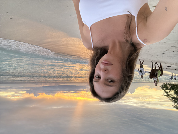 An image captured in a selfie perspective depicts a female subject in the foreground on a sandy beach