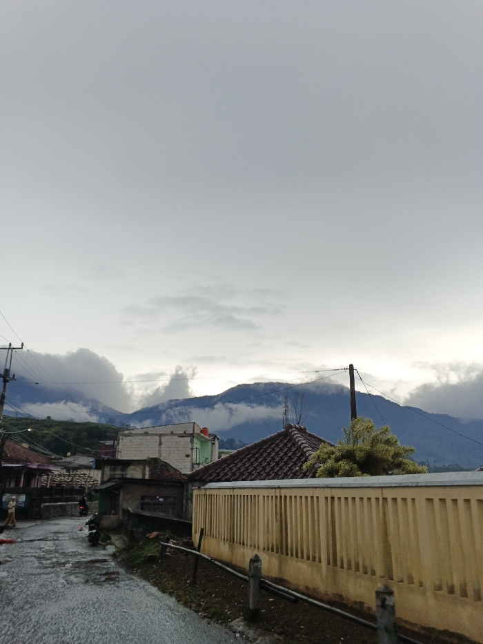 The image depicts an exterior scene in Sindangjaya, Indonesia, characterized by an overcast sky and wet ground, suggesting recent rainfall. In the foreground, a dark, wet asphalt road with visible puddles and lighter patches extends from the lower left towards the mid-ground. Running along the right side of the road is a light yellow concrete wall featuring vertical slats, its base appearing darker. Two dark grey posts are visible in the ground next to the wall in the lower right. Behind this wall, the reddish-brown tiled roof of a building is partially visible, along with a cluster of light green foliage. The mid-ground on the left side of the road features several structures. Closest to the viewer, a building with a reddish-brown tiled roof and multi-colored walls is visible. Further back, another building constructed with concrete blocks, some painted light green, stands with a red cylindrical object (likely a water tank) on its roof. Multiple dark utility poles with overhead power lines are positioned along the left side of the road and extend upwards. Two dark-colored motorcycles are present on the road; one is parked near the left curb, and another is positioned further back with a person seated on it. A solitary person, dressed in light-colored clothing, is visible on the far left edge of the road, near the first structure. The background is dominated by large, dark green mountains. These mountains are partially obscured by extensive, low-hanging white and grey clouds or mist. A thin, dark antenna or pole is visible on the slope of the central mountain range. The sky above the mountains is uniformly light grey and overcast.