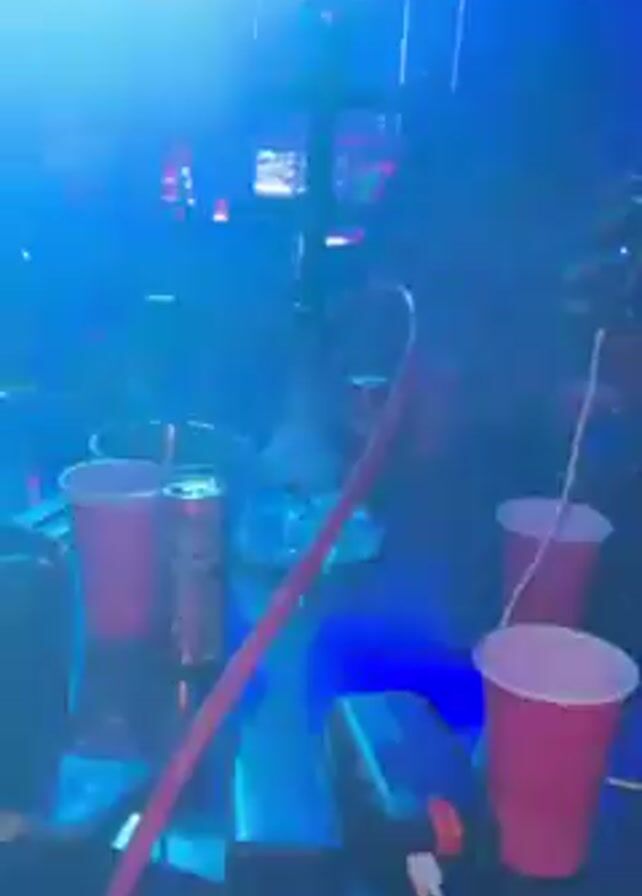 A video captures a vibrant nightlife scene, with colorful lighting, a hookah, and people dancing. The hookah is the central focus, set on a table among red plastic cups and beverages. The lighting transitions between blue, green, and purple, creating a dynamic atmosphere. People are dancing and moving in the background, including a woman in a sparkly purple dress. There appears to be music playing and the mood is festive.