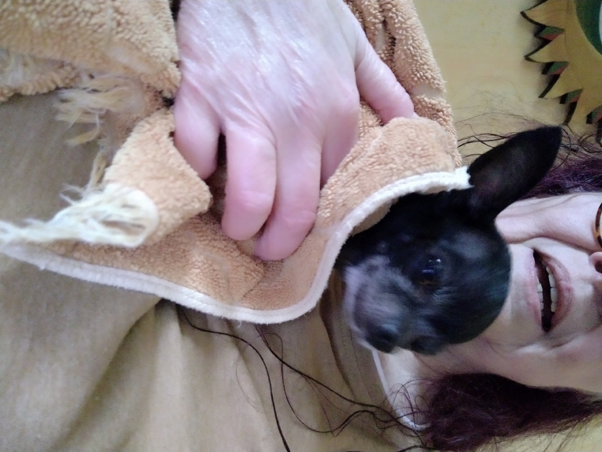 The image depicts an indoor scene in Dortmund, Germany. An adult individual, whose upper facial features from the mouth upwards are visible, is holding a small, dark-furred animal. The individual has fair skin, brown-framed eyeglasses, and dark reddish-brown, possibly wet, hair. Their mouth is slightly open, revealing upper and lower teeth. The animal, appearing to be a small dog or puppy, is predominantly black with dark eyes and upright ears, its head oriented towards the right of the frame. It is wrapped in a light tan terry cloth towel, which appears somewhat frayed at the bottom edge. The individual's left hand is visible, securing the towel around the animal. The background consists of a plain light yellow wall, with a partial view of a decorative sun-shaped wall hanging, featuring yellow, green, and red/brown segments, in the upper left quadrant.