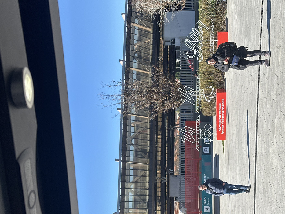 The image depicts an outdoor urban scene in Milan, Italy, specifically in the vicinity of Milano Centrale railway station. The perspective is from within a structure, showing a dark overhead element with a circular light fixture at the top of the frame. Under a clear blue sky, a large, elevated glass and metal pedestrian bridge, characterized by diagonal structural elements, spans horizontally across the midground. Below the bridge, a red barrier or fence is visible. In the lower midground, a public plaza features promotional displays for the Milano Cortina 2026 Olympic and Paralympic Games. Two white wireframe sculptures prominently display the "Milano Cortina 2026" logo, accompanied by the Olympic rings and Paralympic emblem. These sculptures are mounted on a red rectangular base labeled "Olympic and Paralympic Sponsor of Milano Cortina 2026." To their right, another white wireframe sculpture spells out "Lilly." Bare-branched trees with dry leaves are scattered around the display. On the left, a green sign indicates "Treni" (Trains) and "Metro" (subway). Two individuals are present on the paved plaza. On the left, a male in a dark blue puffer jacket, blue jeans, and dark shoes walks towards the right, carrying a black sling bag. On the right, a female in a dark puffer jacket, dark pants, and light sneakers stands, facing slightly left. She carries a dark blue cross-body bag and a dark backpack. No direct interaction between the individuals is observed.