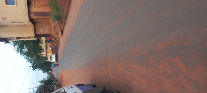The image depicts a street scene in Nibo, Nigeria. A two-lane asphalt road, extensively covered with reddish-brown soil and dust, extends from the foreground towards the background under an overcast sky. In the immediate left foreground, the front quarter of a white and blue vehicle is partially visible. Further along the road, a white van is positioned on the right side, facing away from the viewer. A single individual, wearing a blue top, operates a motorcycle, traveling towards the viewer in the road's center-left. On the right side of the road, a multi-story building, at least three stories tall, featuring a light beige facade and brown window frames, is prominent. Adjacent to the base of this building, a group of approximately seven individuals, dressed in various casual attire including bright colors, are congregated on a raised concrete platform, some seated. A white scooter is parked near this group. A concrete drainage ditch runs parallel to the road on the right. Dense green foliage is visible behind the buildings, extending into the background.
