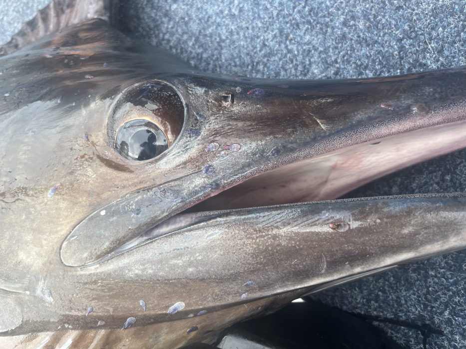 A close-up captures the head of a marlin, its skin a wet, glistening brown