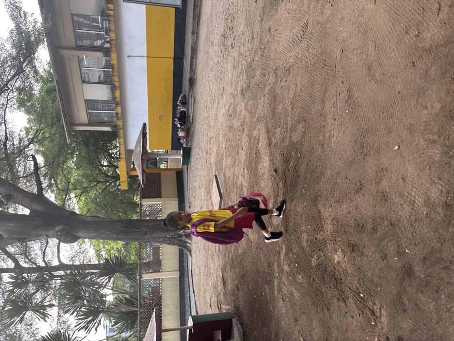 A young girl with a pink backpack and a yellow and purple jersey walks across a dirt field