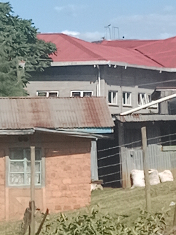 view of a residential area in Tenwek, Kenya, located at coordinates -0.742 latitude and 35.358 longitude. The scene includes two buildings, one with a red roof and one with a rusty metal roof. The building with the red roof is constructed of concrete blocks and has several windows. The building with the rusty metal roof is smaller and appears to be constructed of brick. There is a fence between the two buildings made of black wire and wood posts. The fence is topped with barbed wire. Three large white bags are visible in the background near the fence, along with some green vegetation. The foreground is a grassy area with plants growing in it. There are no people visible in the image.