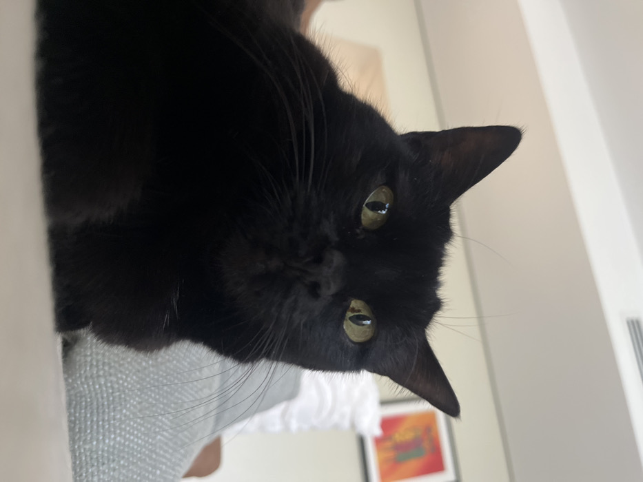- "The image presents a close-up, low-angle perspective of a black domestic cat situated indoors" by FM-leUqa2, licensed under CC BY 4.0