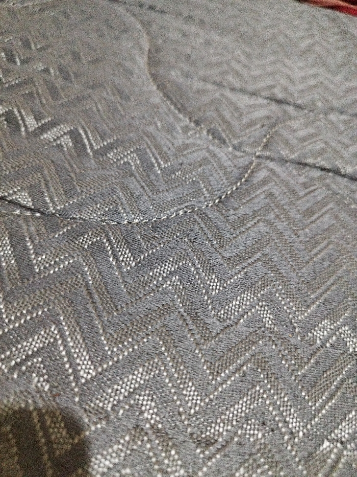 A close-up photograph captures a gray textile surface with a distinct zig-zag (chevron) pattern