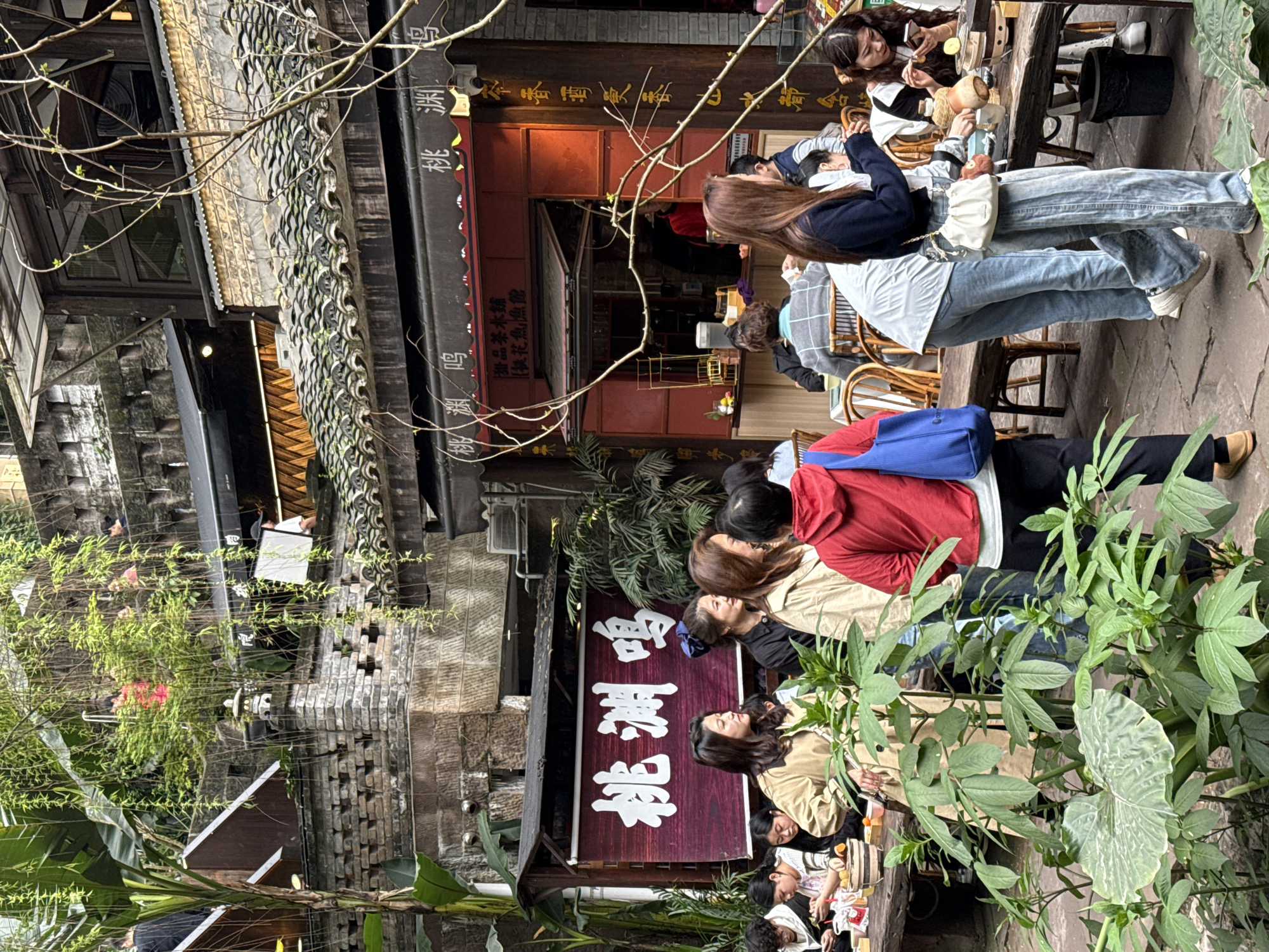 The image captures an active outdoor dining and gathering area within a complex of traditional-style buildings located in Nan'an District, China. The scene features a paved courtyard surrounded by multi-story structures constructed primarily from exposed brickwork with dark-tiled roofs and overhanging eaves. A prominent signage system is visible on the left, displaying large white Chinese characters "桃渊鸭" (Tao Yuan Ya) on a red banner. Beneath this, smaller characters identify "甜品茶水铺" (Dessert and Tea Shop) and "樱花鱼鱼馆" (Cherry Blossom Fish Restaurant). Adjacent to this, a red-painted facade with an open service window reveals an individual in a dark top, possibly staff, inside. A surveillance camera is mounted above this window. Overhead, string lights are partially visible. The environment is characterized by significant greenery, including large-leafed plants, various bushes, and vines hanging from structures, alongside bare branches with visible buds in the foreground. A decorative stone lantern is positioned on a brick wall in the mid-ground. Approximately 20-30 individuals are present, engaged in various activities. Several groups are seated at rustic wooden tables with woven-back chairs, where hotpot-like setups, teapots, and dishes are visible, indicating dining or beverage consumption. Standing individuals include a woman in a red hoodie carrying a blue shoulder bag, facing away from the camera; a woman in a long beige coat with dark hair; and a woman in a dark top and light-wash wide-leg jeans, carrying a white small shoulder bag, observed walking and interacting with a mobile phone. Multiple seated individuals are also using mobile phones. The overall atmosphere appears casual and social.