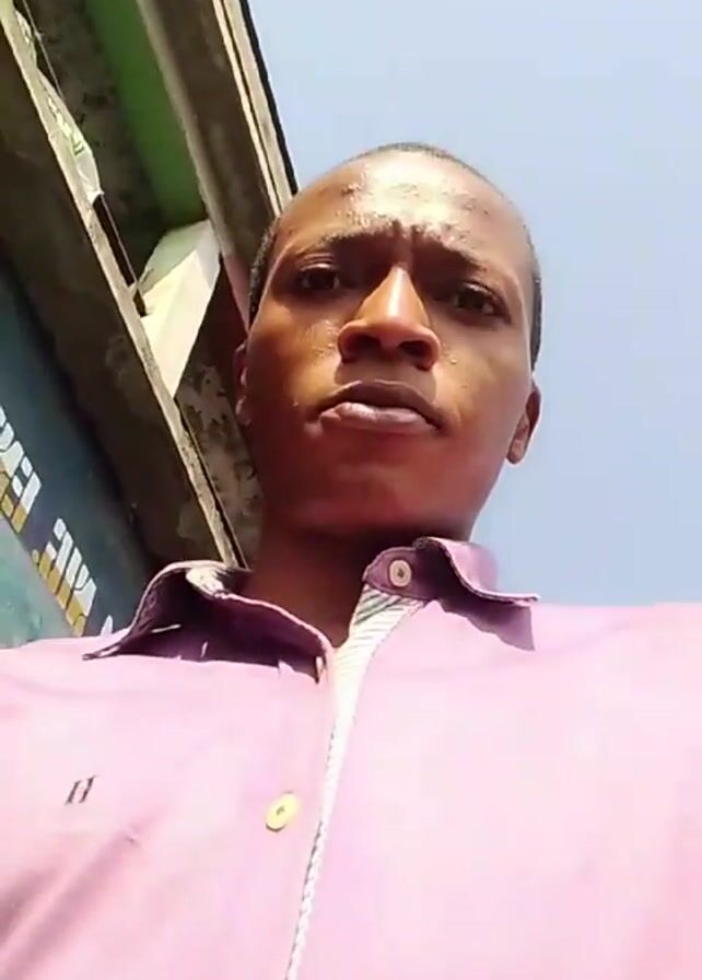 person with a shaved head and a light purple button-down shirt standing outside. The camera is held low, looking up at the person's face. The background includes a clear blue sky and a building with a roof overhang. The person looks directly at the camera with a serious expression. There are some illegible letters visible on the shirt. The camera angle is fixed, and there is no movement.