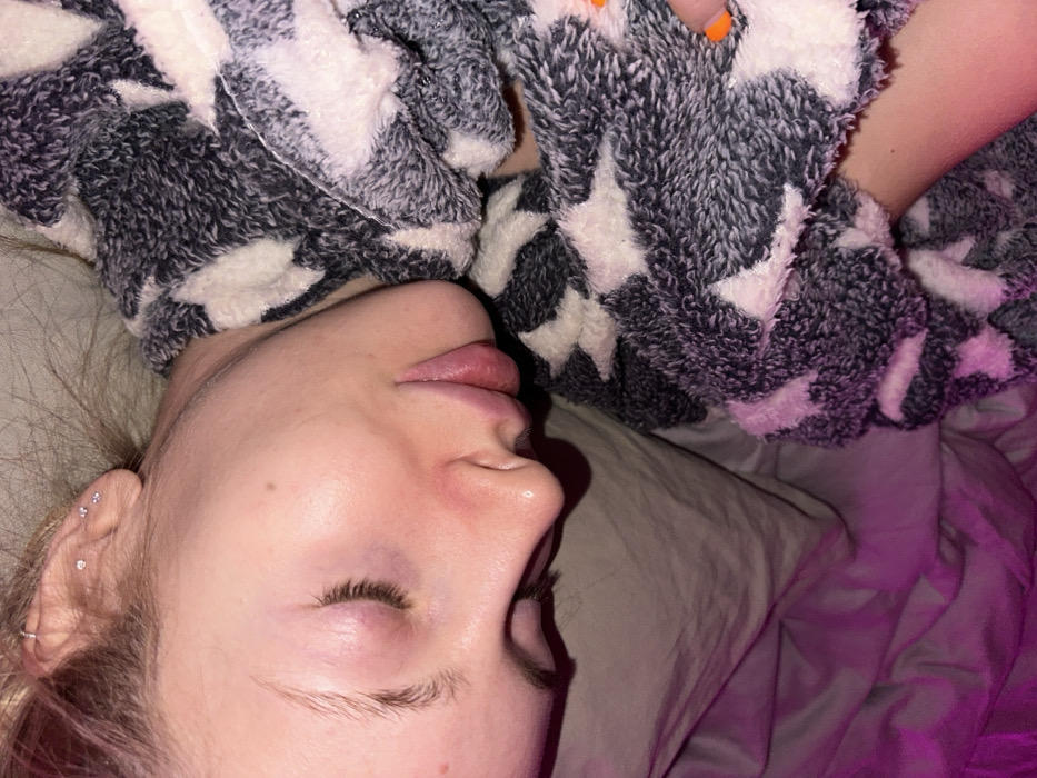 A fair-skinned individual is depicted lying on their left side, with eyes closed, consistent with sleep or unconsciousness