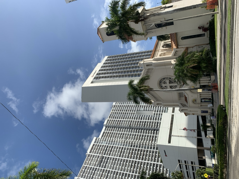 The image displays an urban street scene in Miami, Florida, United States, featuring prominent architectural structures under a clear blue sky with scattered white clouds