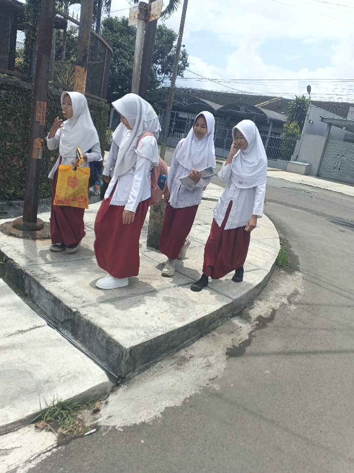 Four young women in matching school uniforms stand on a concrete curb. They wear white hijabs, white long-sleeved shirts with lace trim, and long maroon skirts. One carries a yellow shopping bag, another has a pink backpack, and a third holds a notebook. They appear to be chatting or talking on a phone. A utility pole is to their left and a street and houses are in the background. The sky is partly cloudy.