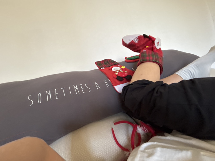 The scene depicts an indoor environment, located in Givatayim, Israel. Two human legs are visible, propped or resting on a grey bolster pillow. The pillow features partial white text, "SOMETIMES A H". The left leg is partially bare, with a red Christmas-themed stocking, decorated with a Santa Claus figure and a yellow star, on the foot. The right leg is covered by black trousers or leggings and a plain light blue/grey sock. A red festive headband with white decorative elements is partially visible on a white sheet or blanket in the lower right foreground. The background consists of a plain, light-colored wall.
