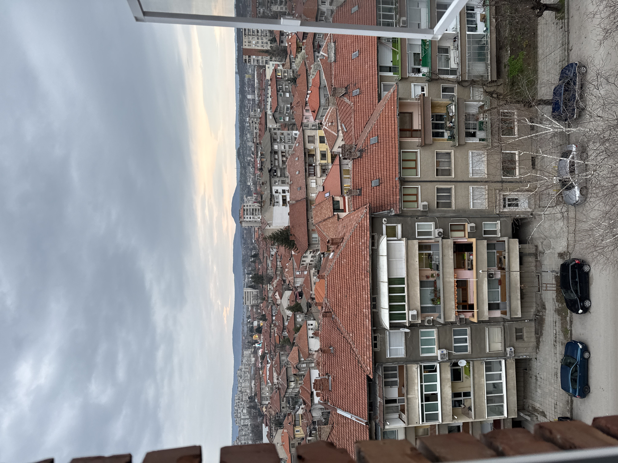 n elevated view over a neighborhood in Lovech, Bulgaria. Predominantly red-tiled roofs cover older buildings in the middle ground, transitioning to taller, Soviet-era apartment blocks on the right. These apartment buildings have rows of windows and balconies and concrete facades. Two cars, one dark and one blue, are parked on the pavement alongside these buildings. In the background, the city extends toward distant hills under an overcast sky. A small portion of a window frame and part of a brick balcony appear in the foreground.