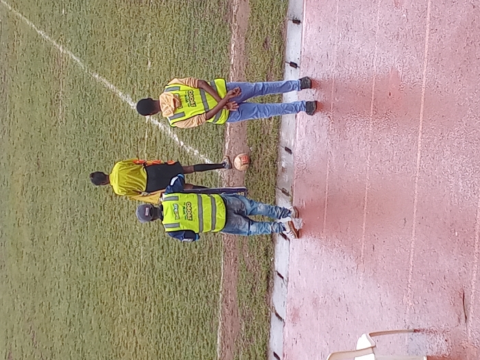 The image displays an outdoor scene from a sports stadium in Meru, Kenya, featuring a football pitch and an adjacent running track, viewed from an elevated vantage point