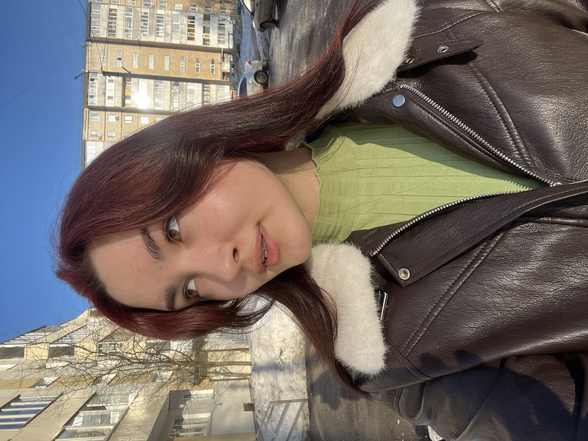 A young woman with auburn hair and brown eyes is seen outdoors in front of a multi-story apartment building, likely located in Neftekamsk, Russia. She is wearing a brown leather jacket with white fur trim and a green shirt. The presence of snow on the ground suggests it is winter or a cold season. The photograph appears to have been taken on a sunny day.