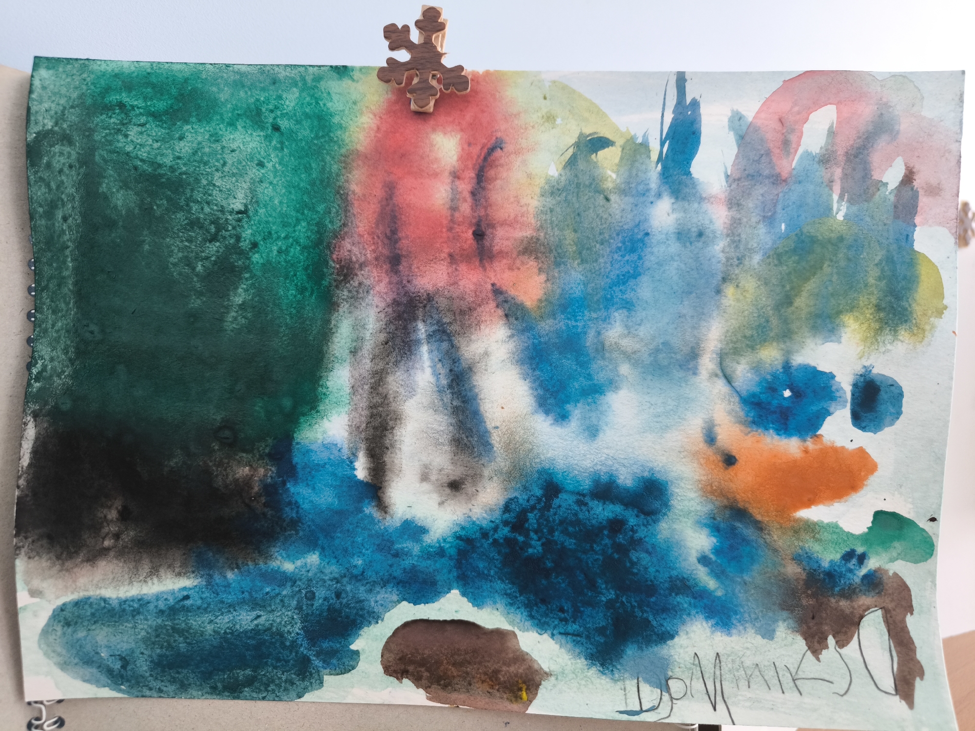 An abstract watercolor painting on light-colored paper is displayed vertically against a plain white background. The artwork features a composition of fluid color washes and blended areas, including dominant dark green and black on the left and lower-left, transitioning into vibrant reds, blues, and lighter greens across the upper and central portions. Orange and brown patches are visible towards the lower right. A dark wooden clothespin, carved in the shape of a snowflake, secures the paper at the top center. The left edge of the paper shows a series of small black rings, indicating it is likely part of a spiral-bound sketchbook. The lower section of the painting rests upon a light brown, flat surface. In the bottom right corner of the painting, a handwritten signature or name, "ДОМИНИКС" in Cyrillic script, is visible in dark ink. No individuals or active interactions are depicted. The visual evidence within the image is insufficient to determine a specific location within the city of Riga, Latvia; the scene appears to be an indoor setting.