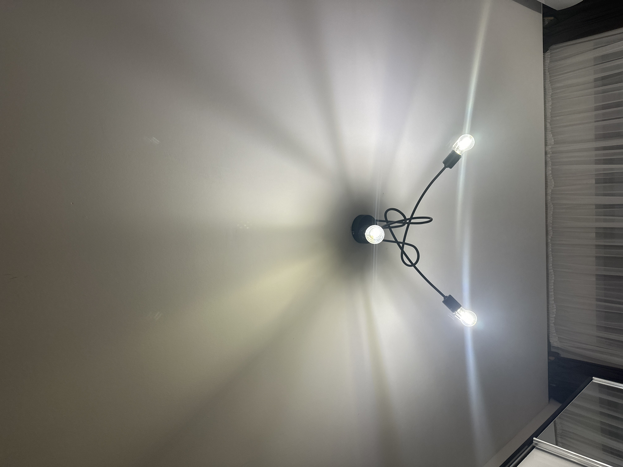 A black three-bulb ceiling light fixture illuminates a room. The light casts shadows on the white ceiling and wall. A window with blinds is visible in the upper right corner. The room appears to be indoors. The image does not provide sufficient information to locate the specific location of the scene in Lovech, Bulgaria.