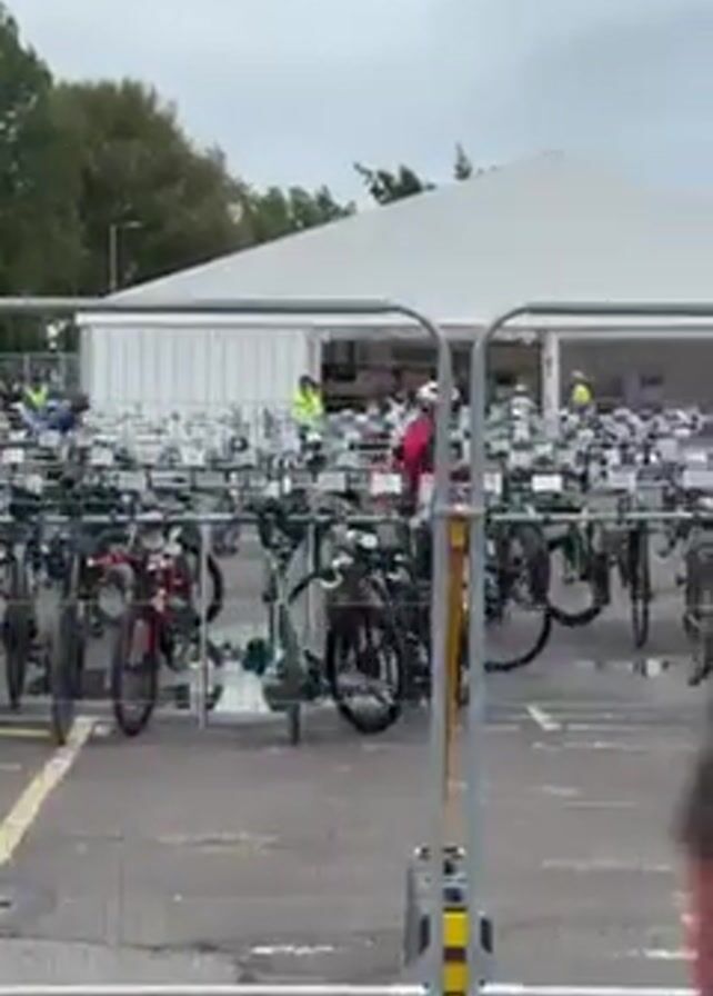 cyclist in a red shirt, black shorts, and a white helmet, pushing their bike through a crowded bicycle parking area. The parking area is filled with numerous bicycles secured in rows of racks. In the background, a white tent-like structure is visible, suggesting a possibly organized event or competition. The day appears overcast. A second person in a blue shirt and black shorts with sunglasses walks in front of the camera. The cyclist appears to be heading away from the tent and towards the street or another section of the event.