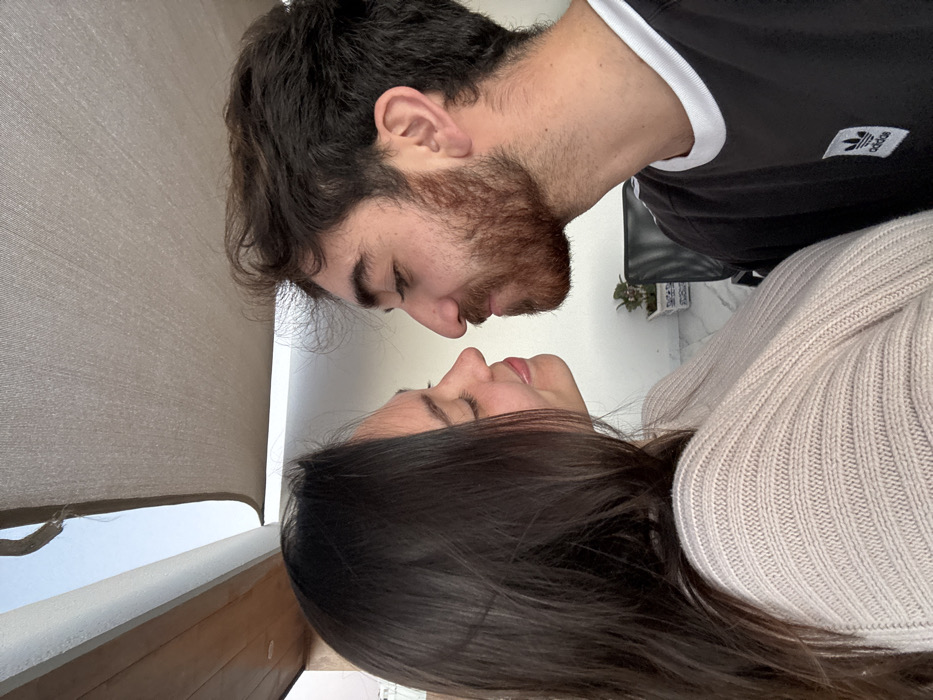 A close-up image captures a couple nose-to-nose, almost touching. The man, positioned at the top, has dark hair and a beard. He wears a black Adidas shirt with white trim. The woman below has long, dark hair and wears a beige sweater. The background features a partially visible roller blind, a wooden structure, and hints of an interior space with a potted plant. The orientation is rotated, giving a tilted perspective.