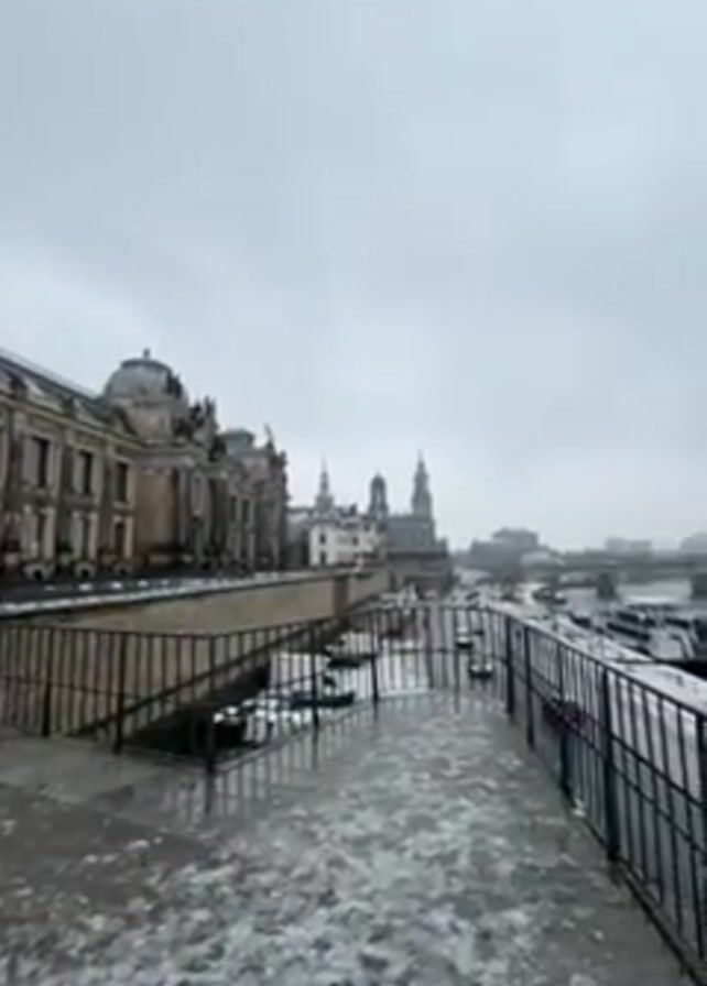 wintry cityscape scene in Dresden, Germany. The camera pans across a snow-covered walkway with a black metal railing, offering a view of the Elbe river and the city skyline. Prominent buildings, including the Dresden Castle, Frauenkirche, and Augustus Bridge, are visible in the background. A large tour boat is docked along the snowy riverbank. The sky is overcast, adding to the cold, wintry atmosphere.
