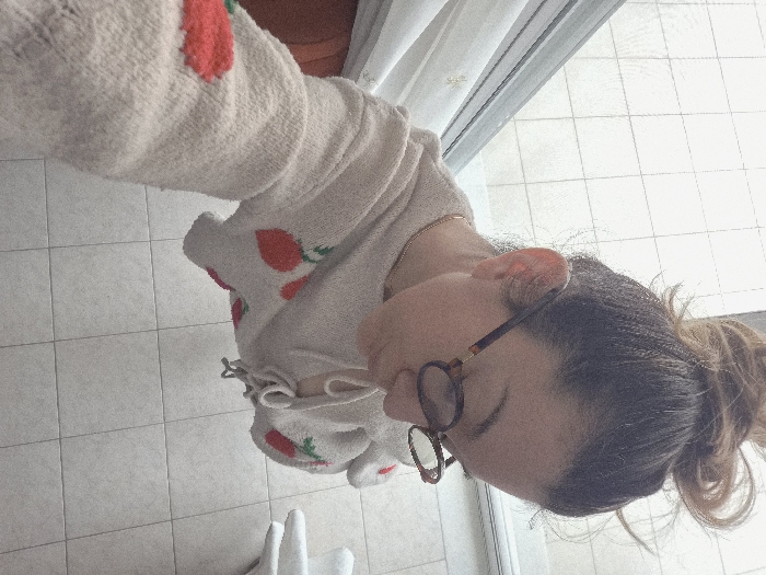 A forensic examination of the image reveals an indoor scene within the Municipal Unit of Corinth, Greece. The primary subject is a female individual, photographed from an overhead angle, capturing her head and upper torso. Her dark brown hair is styled in a messy bun. She wears eyeglasses with dark, tortoise-shell frames and a thin, gold-colored chain necklace. Her attire consists of a light-colored, possibly cream or beige, knitted sweater or robe adorned with multiple red strawberry motifs. The subject's gaze is directed downwards. The visible environment includes a light-tiled floor composed of square tiles. To the left, a white curtain or panel, possibly a shower curtain, is partially visible, with an indistinct reddish-orange object positioned behind it. To the right, a white, textured object, consistent with a folded towel or a ceramic fixture, is partially observed.