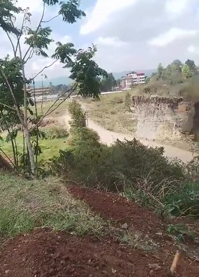 landscape with a dirt road running through it. On the right side of the road, there is a cliff or embankment with exposed rock and vegetation. The foreground is a pile of dirt and grass. In the distance, there is a building visible. A person on a motorcycle drives down the road. The sky is partly cloudy. The camera is somewhat out of focus.