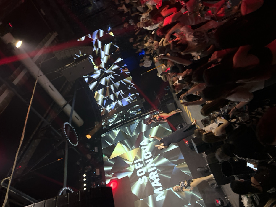 An indoor concert venue or nightclub in Burgas, Bulgaria, features a live performance by Sofi Marinova