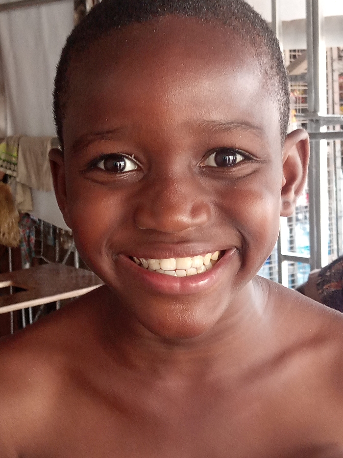 The image presents a close-up, frontal portrait of a child with dark brown skin in Obosi, Nigeria. The child has short, dark hair, dark brown eyes, and a broad nose. The child is smiling broadly, displaying a full set of white teeth and slight crinkling around the eyes. The shoulders and upper chest are bare. The background is out of focus: to the left, light-colored fabrics or clothing are visible, possibly hanging, along with a blurred brown structure. To the right, a metal grate or security bars are present, beyond which indistinct objects, including a blue container, are visible.
