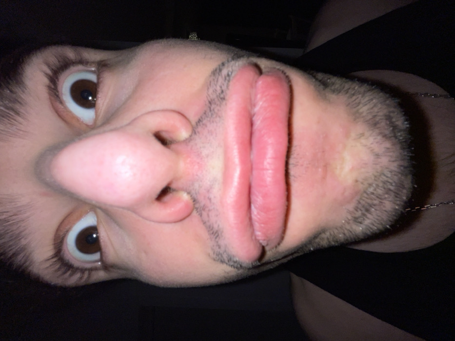 A close-up, tilted perspective of a man's face, focusing on his eyes, nose, and lips. His eyes are wide with brown irises, and his nose is prominent. His lips are full and pink, and he has stubble around his mouth and on his chin. A silver chain is visible on his neck. The background is dark, with a hint of black clothing visible on his shoulder and chest.