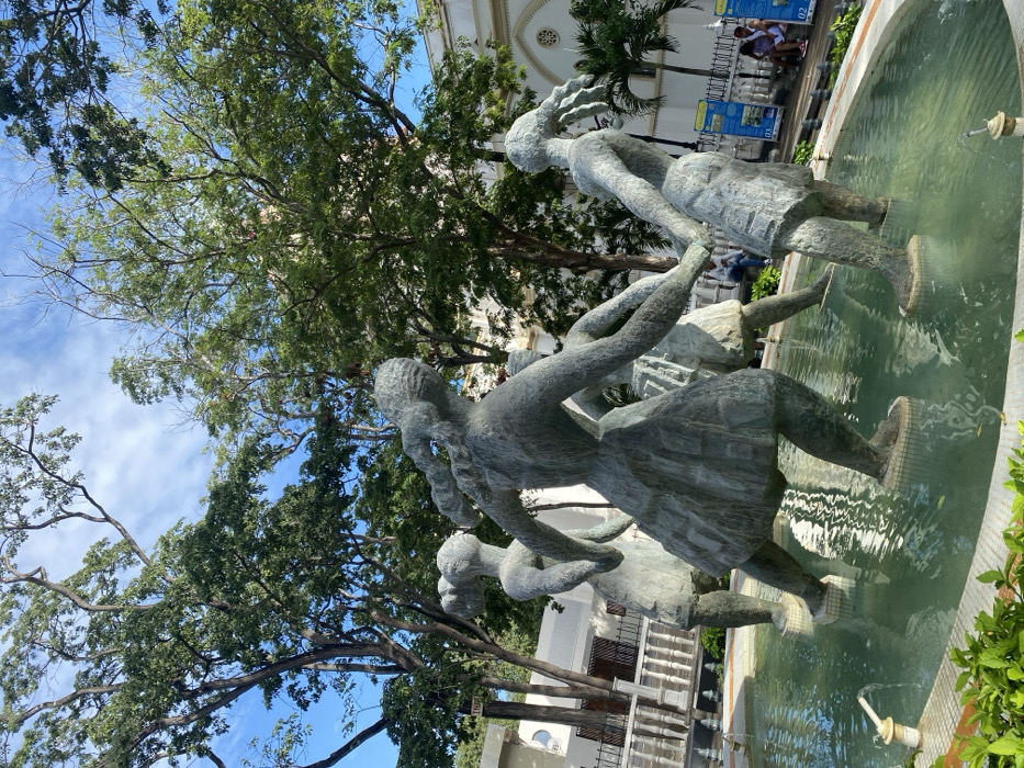 A statue of children dancing in a circle stands in a fountain under large trees. The figures appear to be made of a dark stone or metal. In the background is a white building with arched windows and a palm tree. Blue informational signs are visible behind a white railing. Water flows from the fountain, creating ripples on the surface.
