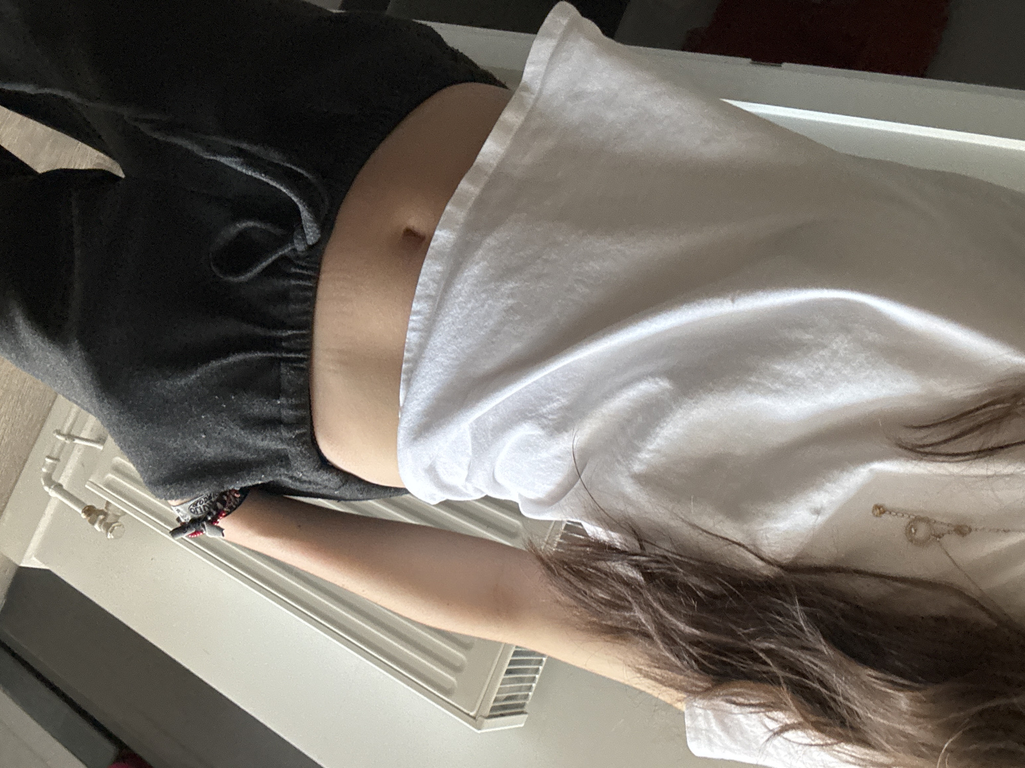 The image displays the partial view of a single individual, likely female, standing indoors. The subject is wearing a white short-sleeved crop top, revealing the midriff and navel, and dark grey sweatpants secured with a visible drawstring knot at the waist. A gold-toned necklace with two distinct pendants, one ring-shaped and one spherical, is worn around the neck. A multi-colored fabric bracelet is visible on the right wrist, and long, dark brown hair cascades over the right shoulder and chest. The individual's right hand is partially obscured, possibly within a pocket of the sweatpants. In the background, a white door frame is visible on the left side of the image, with a dark reddish-brown surface partially visible beyond it. On the right, a white panel radiator is mounted on a light-colored wall, with white pipes extending downwards. The floor, visible at the bottom of the frame, appears to be a light-toned surface. The visual content of the image contains no discernible landmarks or unique features to confirm the specific geographic location as the city of Hull, United Kingdom.