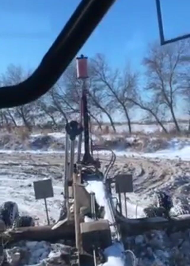 view from inside the cab of a construction vehicle, possibly a grader, as it drives across a snowy, muddy field