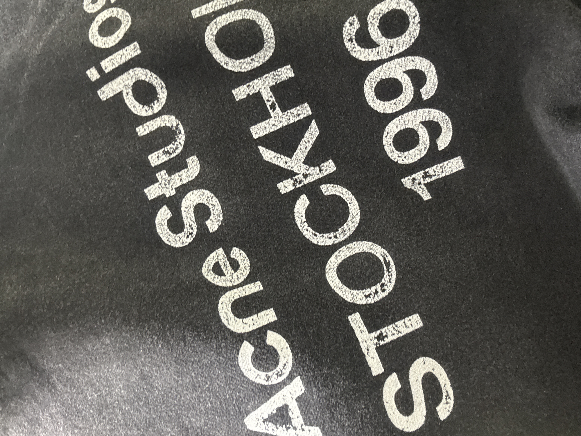 Close-up image of the words "Acne Studios STOCKHOLM 1996" printed in white on a black background.