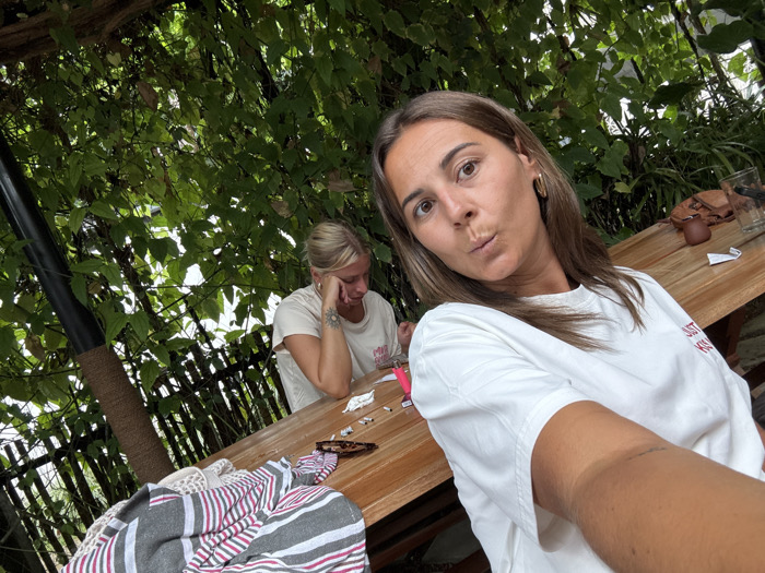 Two women sit at a wooden table outdoors under a canopy of green leaves. The woman in the foreground takes a selfie, pouting her lips. She wears a white t-shirt. The other woman sits farther back, resting her head on her hand, wearing a light-colored shirt. A striped blanket sits on the edge of the table, with various items scattered around the table, including a pink object and what appears to be sunglasses. A bag is partially visible in the background.