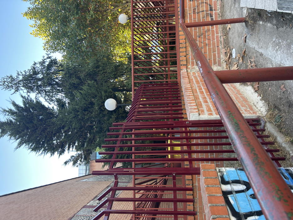 The image displays an outdoor scene within the Universidad Complutense de Madrid (UCM) Ciudad Universitaria campus in Madrid, Spain, under clear daylight. In the immediate foreground, a weathered dark red metal handrail extends from the lower right, partially corroded with greenish patches. Below it, a concrete path with scattered dried brown leaves leads to a lower red brick wall section on the left, which is defaced with blue and black spray paint graffiti. Dominating the midground is a robust dark red metal fence system. This includes vertical bar sections and angled, spiked top sections, forming a barrier and possibly a gate. Behind a segment of this fence, a yellow object, possibly a bin or container, is partially visible. A two-tiered red brick wall structure supports sections of this railing system. The left side of the background reveals a portion of a large red brick building featuring multiple windows with distinctive, intricate geometric patterns, possibly metallic grates over glass. The central and right background are characterized by dense foliage, including tall evergreen conifer trees and deciduous trees with green and yellowing leaves. Two white spherical outdoor lamp posts are visible on dark poles, positioned among the trees. The sky is bright and clear blue. No individuals are present in the scene.
