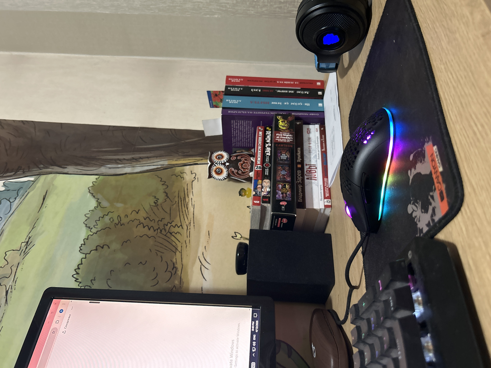 The image depicts a workstation on a wooden surface. The focal point includes a partially visible laptop screen displaying a Windows activation message. To the right of the laptop, there's a speaker and a keyboard. Further to the right is a mouse, positioned on a mousepad labeled "Canyon Gaming." Behind the speaker, there is a collection of books with visible titles, including "Demon Slayer," "My Hero Academia," "Five Nights at Freddy's," and works by Bulgarian authors. On the leftmost side of the image, there is a partially visible drawing or painting, possibly on a wall. A pair of headphones sits on top of the books. An owl figurine is placed between the books and the picture. The location cannot be determined from this image, despite the presence of Bulgarian books.