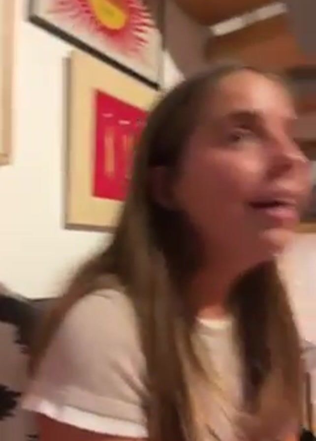 three young women in a room. The room has a low wooden ceiling with exposed beams, and several pieces of framed artwork hang on the wall. The first woman has shoulder length, brown curly hair and wears a red sweater. The second woman has long straight brown hair, and wears a white t-shirt. The third woman has blonde hair, and wears a white top. The woman with long brown hair speaks, and the other two women are visible behind her. One is on a couch with black and white pillows, and the other is partly cut out of the frame. The blonde haired woman makes a face and sticks her tongue out. The video moves around a lot, and the people speak in another language.