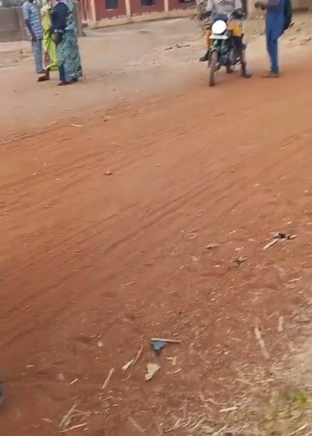The video appears to be shot from the perspective of a person riding a motorcycle on a dirt road in what looks like a rural area. Several people are standing on the side of the road, and another person is sitting on a motorcycle. The person filming the video then starts riding their motorcycle down the road. There are buildings in the background and some debris on the ground. The video is shaky due to the movement of the motorcycle.