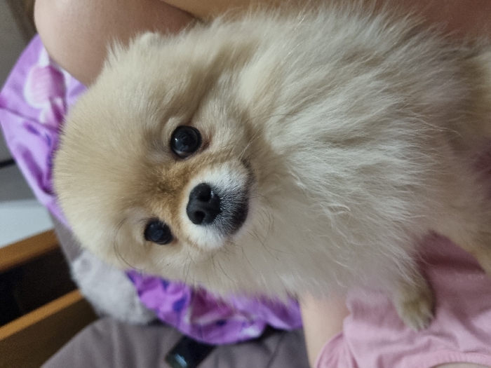 A cream-colored Pomeranian dog is lying down and looking at the camera