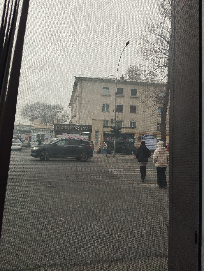The image, captured through a fine mesh screen, depicts an urban street scene in Kokand City, Uzbekistan, under an overcast sky