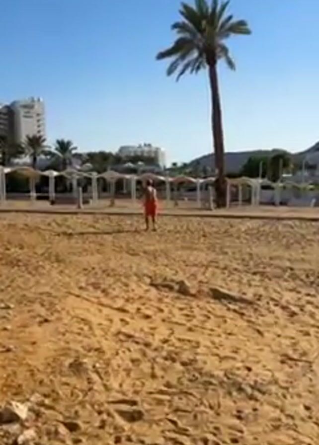 A video shows a man playing tennis on a sandy beach on a sunny day