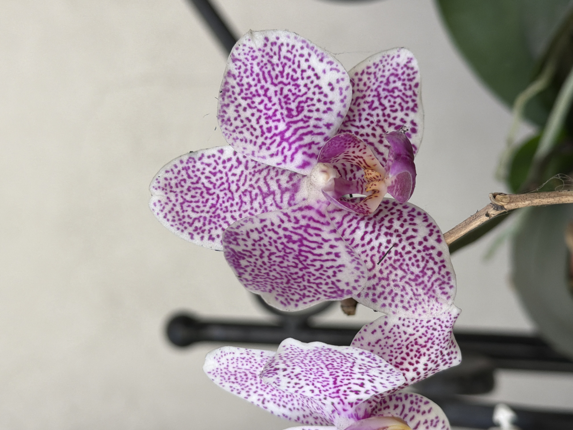 close-up view of a cluster of orchid flowers with white petals speckled with purple spots. The petals are slightly ruffled. The center of the flower is also purple with some yellow accents. The flowers are attached to a thin brown stem. In the background, there is a blurred white wall, part of a dark metal structure, and out-of-focus green leaves. There is no information in the image indicating it was taken in Cuautla, Mexico.