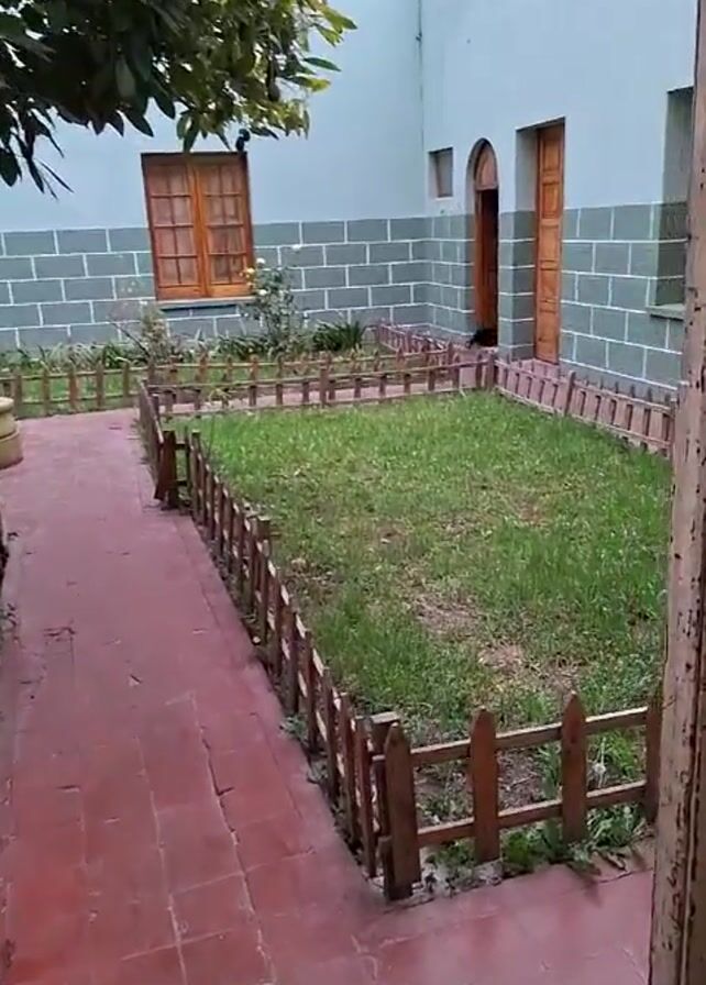 courtyard garden with a red tile path running through it. The garden has a low wooden fence around a patch of grass. In the background, there's a building with light blue walls and dark gray brick trim. The building has wooden windows and doors. Two people are seen near a stone structure, possibly a fountain, in the distance. There is a tree in the left foreground. The camera pans slightly to the left.