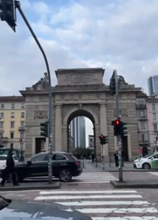 city street scene with a large, stone archway in the center of the frame. Several cars and a scooter are stopped at a crosswalk in front of the archway, waiting for the traffic light to change. People are walking near the crosswalk and in the archway. Buildings are visible on either side of the street, and a tall skyscraper is seen through the archway. The sky is partly cloudy.