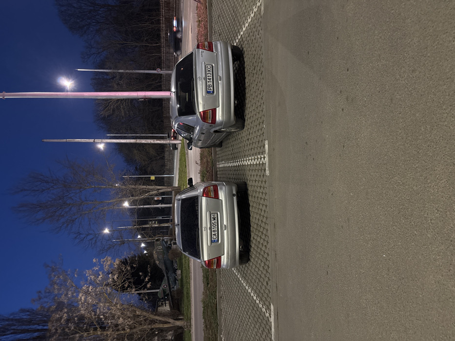 The image depicts an outdoor night scene in Dobrich, Bulgaria, specifically at the monument to fallen pilots located near Svoboda Park and the intersection of Oktomvriiska Street. The sky is a deep twilight blue. In the immediate foreground, a dark asphalt surface is visible. Beyond this, two silver Opel Astra G hatchbacks are parked side-by-side on a light-grey interlocking paver parking lot, positioned within marked parking spaces indicated by white lines. The vehicle on the left bears Bulgarian license plate "CA 8105 MH". The vehicle on the right bears Bulgarian license plate "PB 1413 KC". Both vehicles feature tinted rear windows. In the mid-ground, a paved road separates the parking area from a grassy median. On this median, to the left of the frame, a dark green or camouflage-painted fighter jet, consistent with a MiG-15 or similar model, is mounted on a pedestal as a static display. The number "70" is visible on the aircraft's tail section. Bare deciduous trees and some evergreen foliage are visible behind the aircraft and along the roadside. Multiple tall streetlights, equipped with illuminated fixtures, are positioned along the road and in the background, casting light on the scene. Distant vehicles with illuminated headlights and taillights are visible on the road in the far background, appearing blurred due to motion, indicating ongoing traffic. No individuals are visible in the frame.